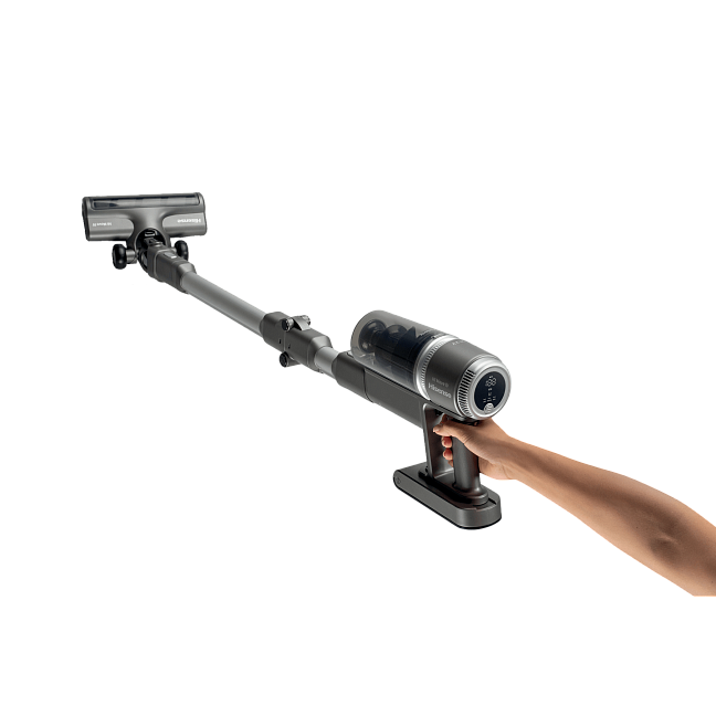 Полностью управляйте пылесосом с помощью интеллектуального светодиодного дисплея, на котором отображается текущее состояние аккумулятора, режим работы (низко-, средне- или высокоскоростной) и уровень заряда. На нем также появляется сообщение, если забилась трубка или нужно очистить контейнер для сбора пыли.