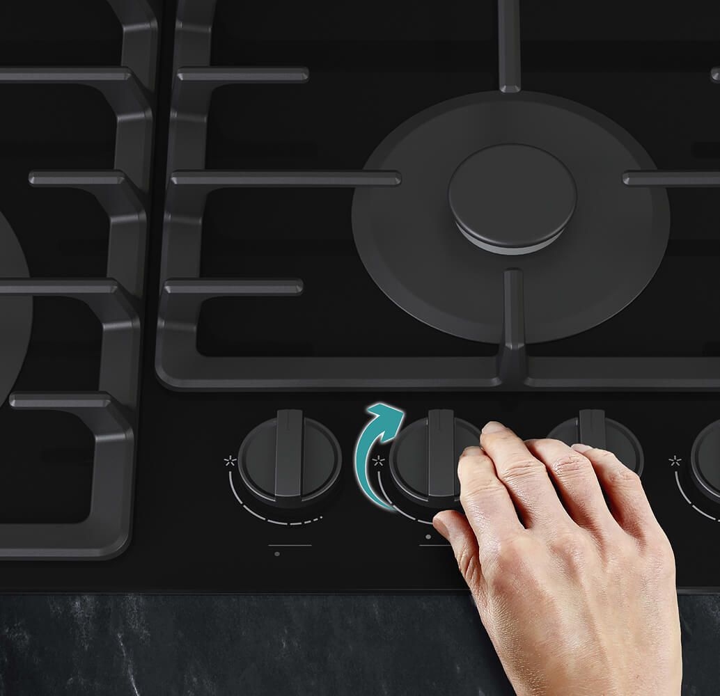 Розжиг конфорок стал максимально удобным — просто нажмите и поверните ручку регулировки. Система автоматически подает искру, позволяя легко управлять пламенем даже одной рукой.