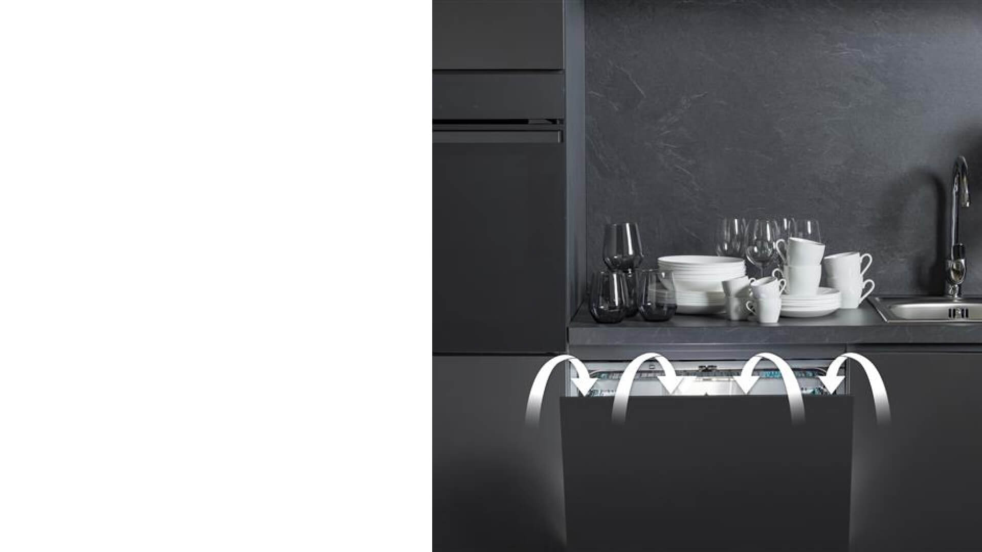 Встроенный вентилятор и автоматическое открывание дверцы в конце программы выводят пар из моечной камеры, обеспечивая полное высыхание посуды и предотвращая повреждение мебели из-за влаги.