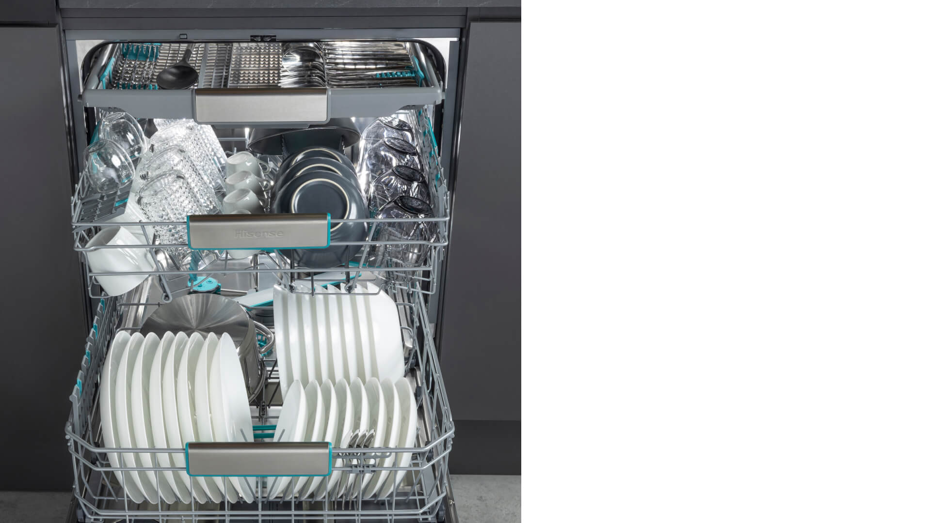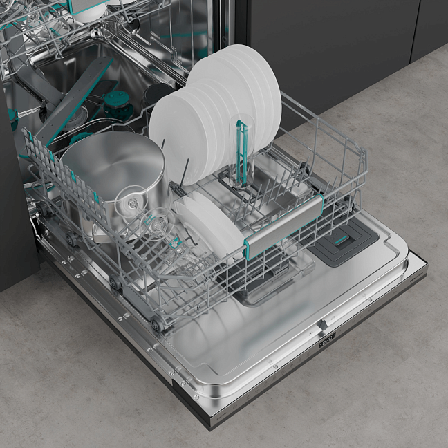 Двухуровневая система установки корзины позволяет размещать даже самые большие кастрюли и тарелки, а складные держатели для тарелок и специальный лоток для столовых приборов обеспечивают оптимальное мытье и сушку.