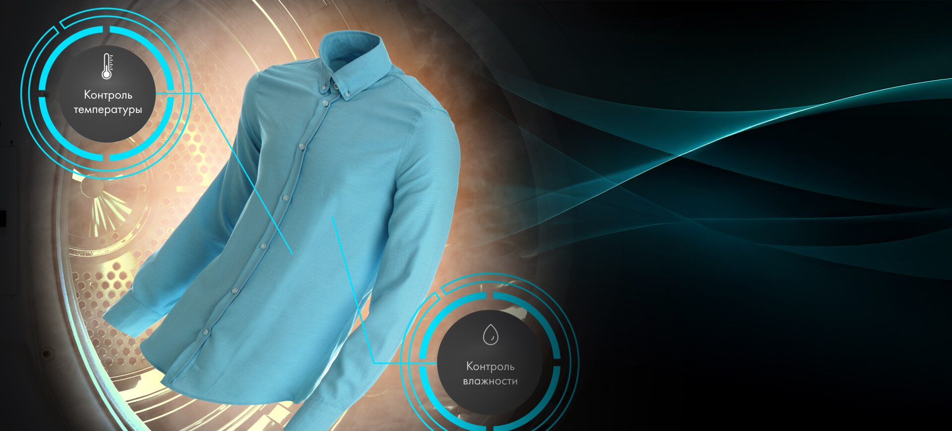 Встроенный датчик точно анализирует уровень влажности и температуру белья, автоматически регулируя время и интенсивность сушки. Технология экономит электроэнергию и защищает ткань от перегрева.