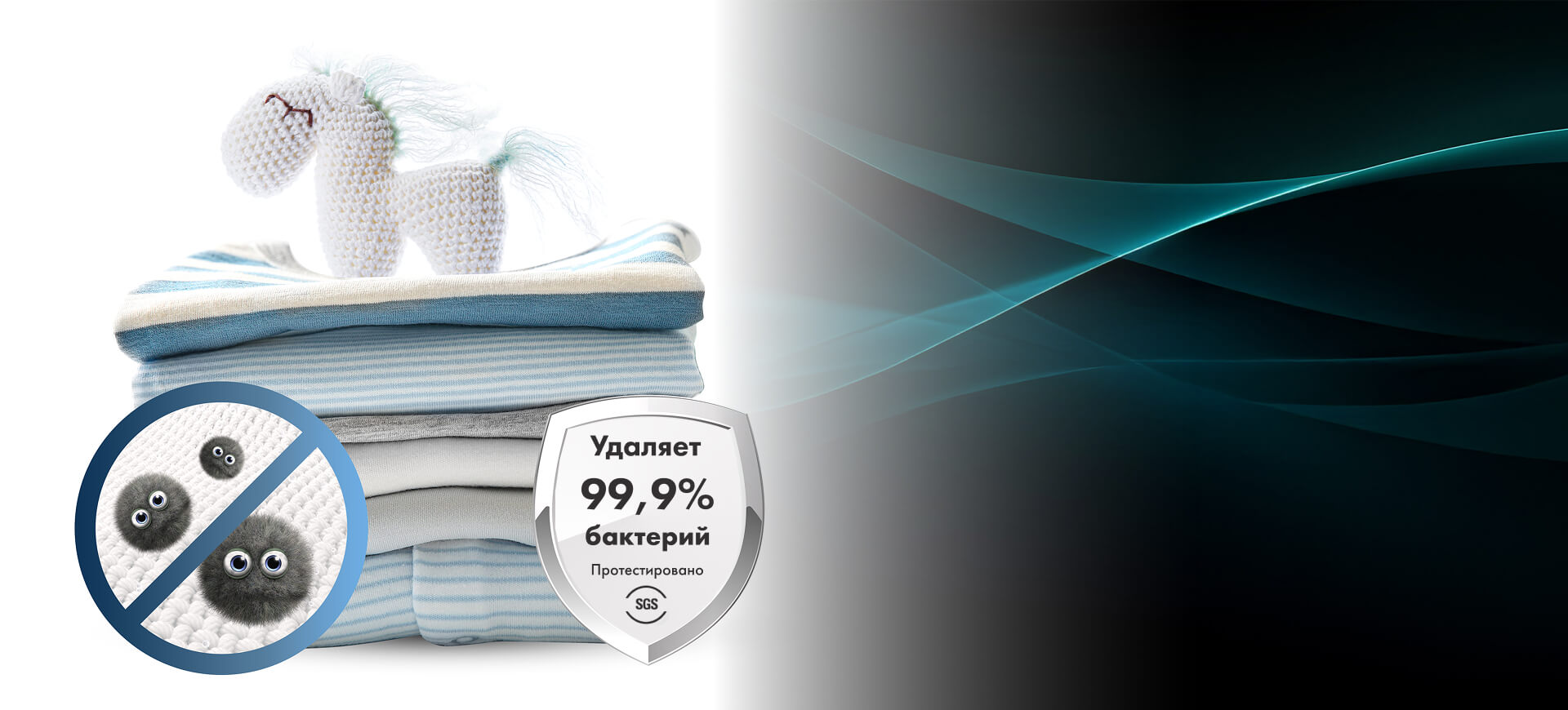 Во время этой специальной программы с эффектом стерилизации воздух нагревается до высокой температуры и уничтожает до 99,9% бактерий, делая одежду чистой и сухой.