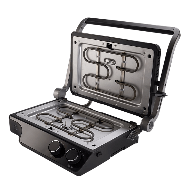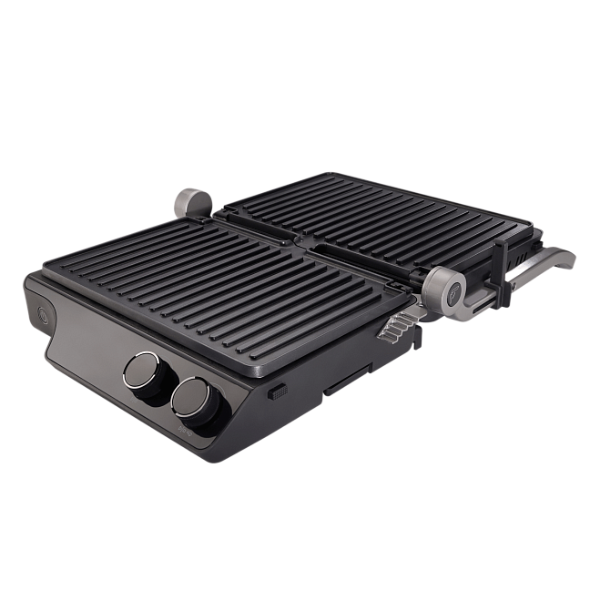 размером 34×23 см, а общая площадь приготовления в открытом положении достигает 1560 см². Такая конструкция расширяет возможности: от быстрых домашних бутербродов до барбекю на свежем воздухе.