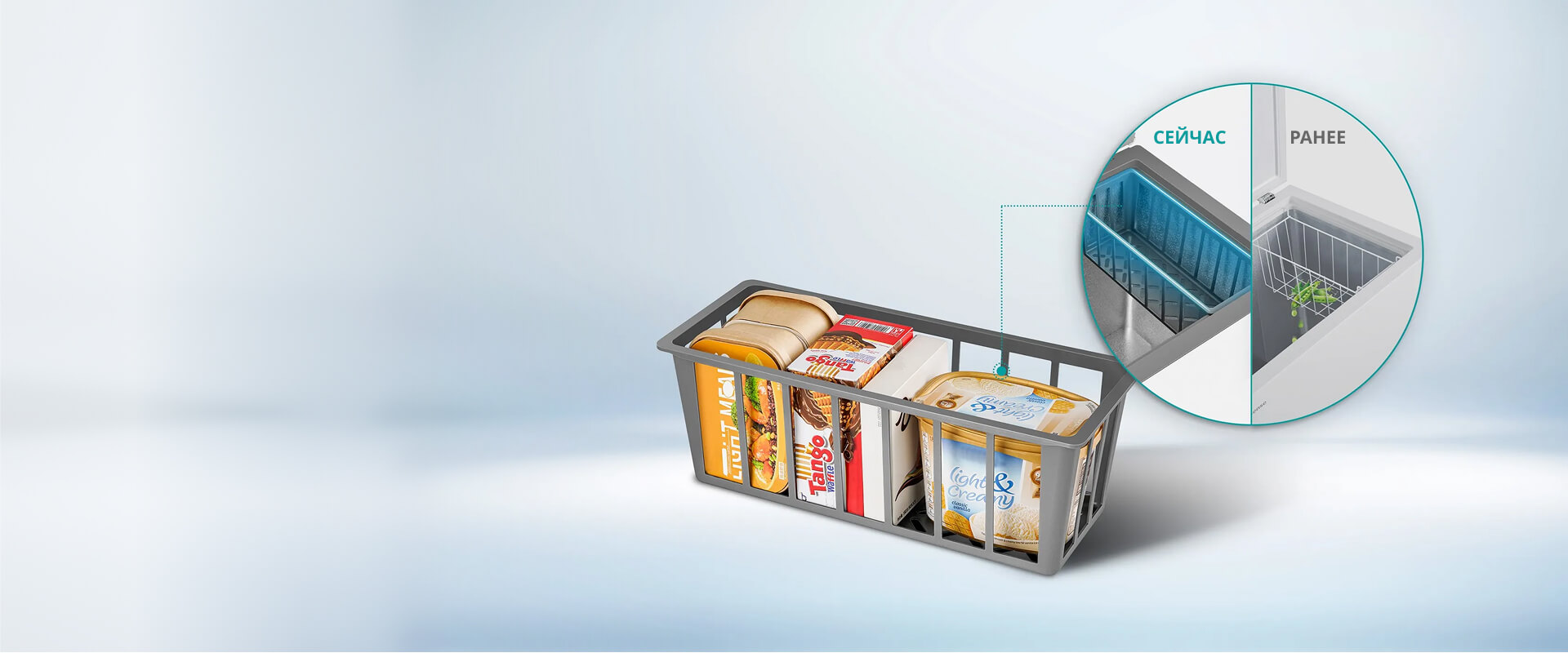 Усовершенствованная корзина с плавным ходом предотвращает рассыпание продуктов. Теперь гораздо легче найдёте любимое мороженое, не вынимая всё содержимое.