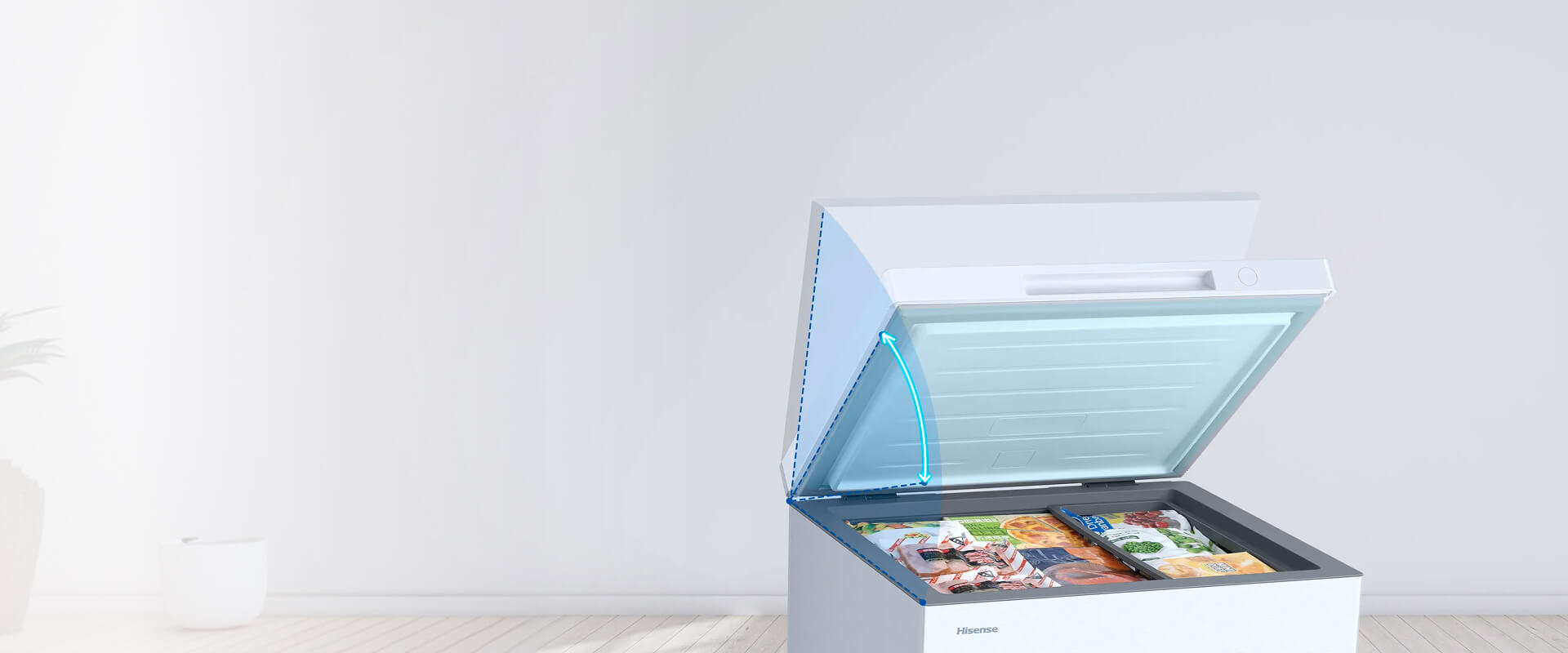 Функция позволяет зафиксировать дверь морозильного ларя под углом от 30° до 60° и оставить её в этом положении. Теперь не нужно придерживать дверь, загружая или доставая продукты.