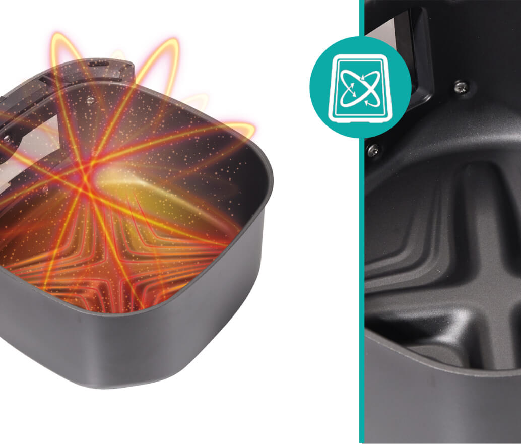 Волнообразное дно жарочной корзины оптимизирует циркуляцию воздуха, обеспечивая более быстрое и равномерное приготовление. Благодаря постоянной трехмерной циркуляции горячего воздуха продукты равномерно прогреваются со всех сторон, поэтому вам не потребуется их встряхивать или переворачивать.