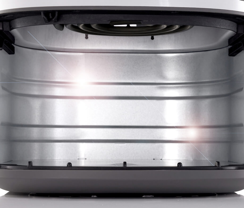 Стенки отсека для корзины изготовлены из высококачественной нержавеющей стали, что обеспечивает безопасность и долгий срок службы прибора, а также предотвращает появление неприятного запаха пластика. Нагревательный элемент, вентилятор и освещение расположены сверху и обеспечивают идеальное распределение тепла. Металлическая поверхность легко моется, и при регулярной очистке из аэрофритюрницы будет исходить только аромат вкусной еды.