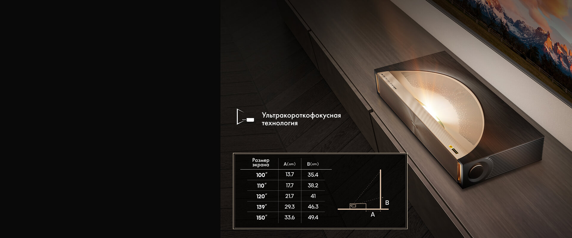 Оцените удивительную компактность конструкции. Усовершенствованный ультракороткофокусный объектив с отношением всего 0,18 проецирует огромное изображение кинематографического масштаба на расстоянии всего нескольких сантиметров от стены или экрана — не жертвуя разрешением или четкостью и не загромождая пространство.