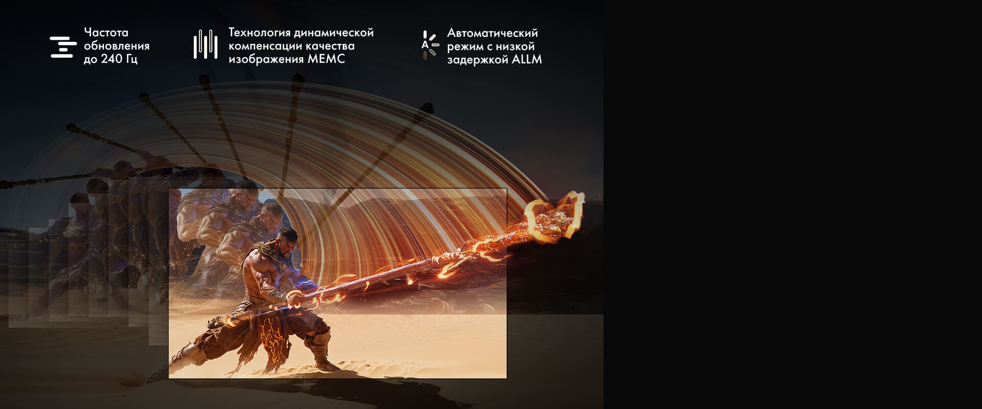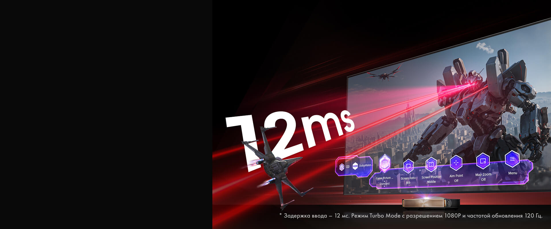 Главенствуйте во всех состязаниях с помощью игровых преимуществ. Режим Game Mode делает ставку на производительность, сокращая задержку ввода до 12 мс*. Режим Turbo Mode оттачивает каждое движение, а игровая панель держит под рукой ключевые настройки. Результат — более стремительные реакции и молниеносный отклик.