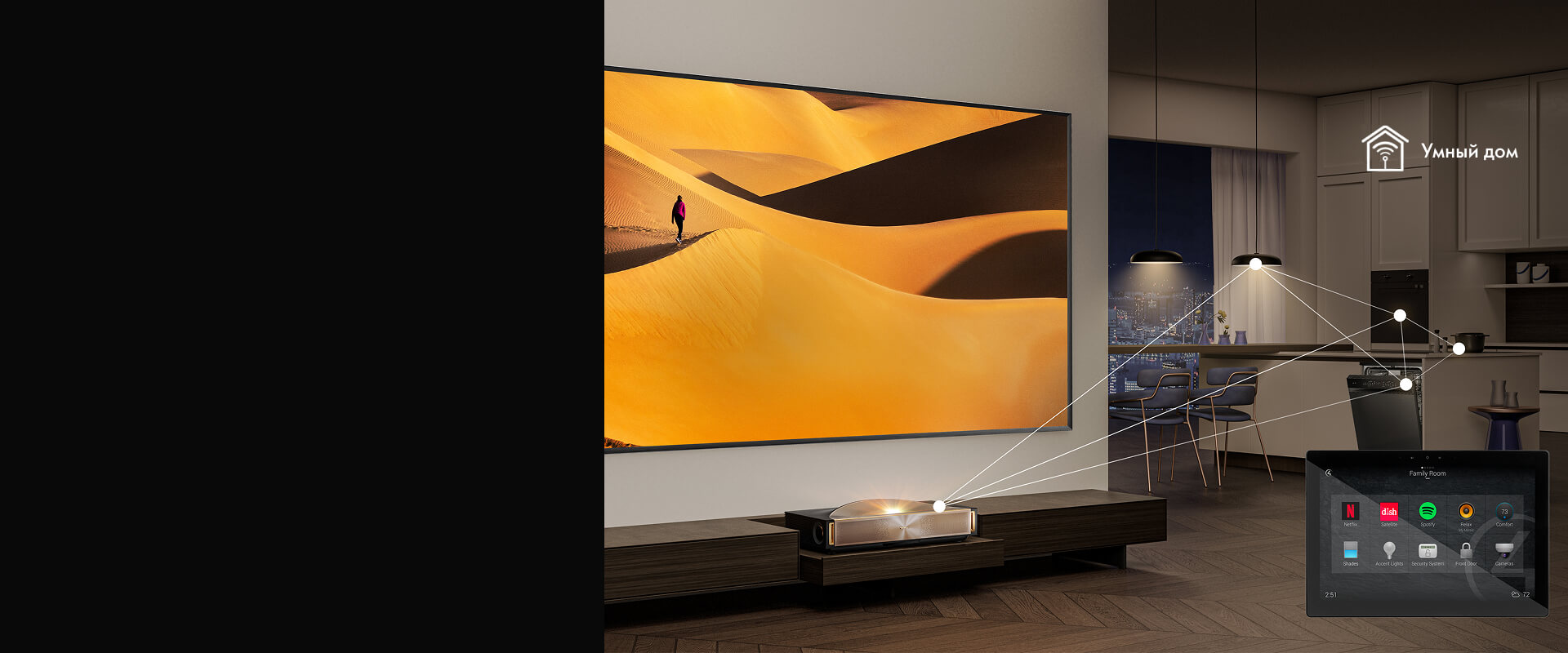 Путем синхронизации с ключевыми системами умного дома, такими как Control4 и URC, телевизор Hisense L9Q позволяет переключать каналы, изменять громкость, управлять входами, освещением и прочими функциями. Комплексный и бесшовный контроль в вашем распоряжении.