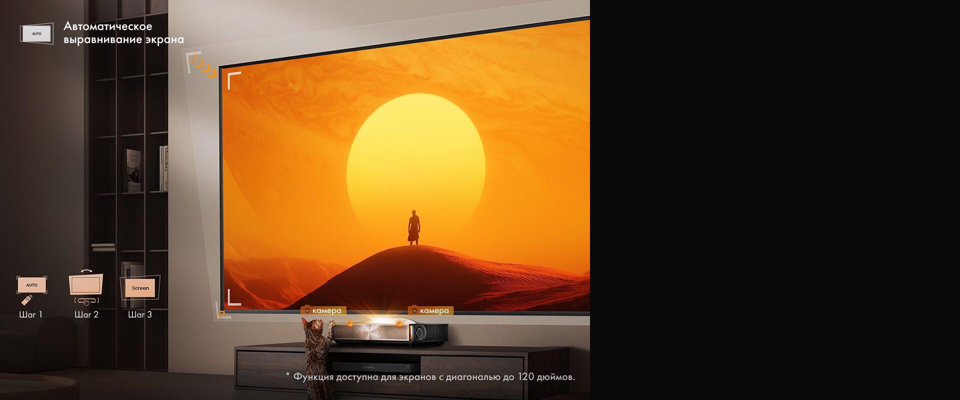 Настройте свой лазерный телевизор за считанные секунды. Активируйте функцию автоматического выравнивания экрана, разместите Hisense L9Q в желаемом месте — встроенные камеры возьмут на себя остальное.