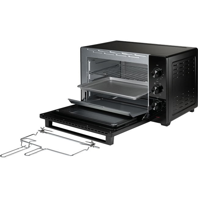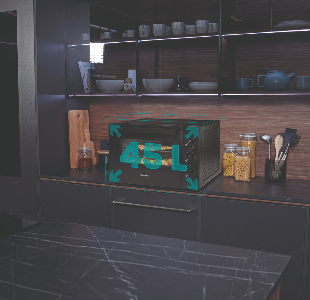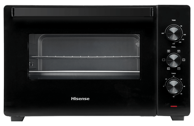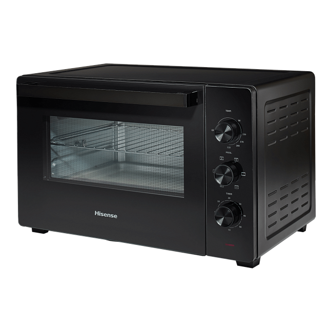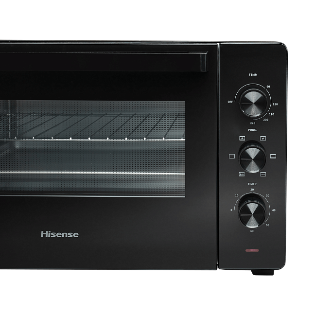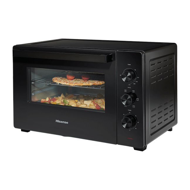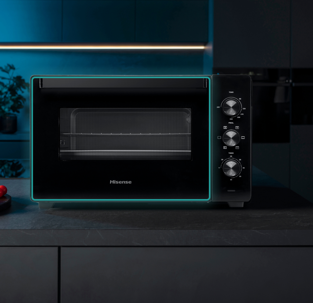 Мини-печь Hisense может легко заменить полноразмерную духовку на небольшой кухне. Вы можете полностью настроить ее работу в соответствии со своими потребностями. Для этого на ваш выбор пять режимов работы (нагрев сверху и снизу в сочетаниях с конвекцией или вертелом), регулировка температуры в диапазоне от 90 до 220°С и таймер до 60 минут.