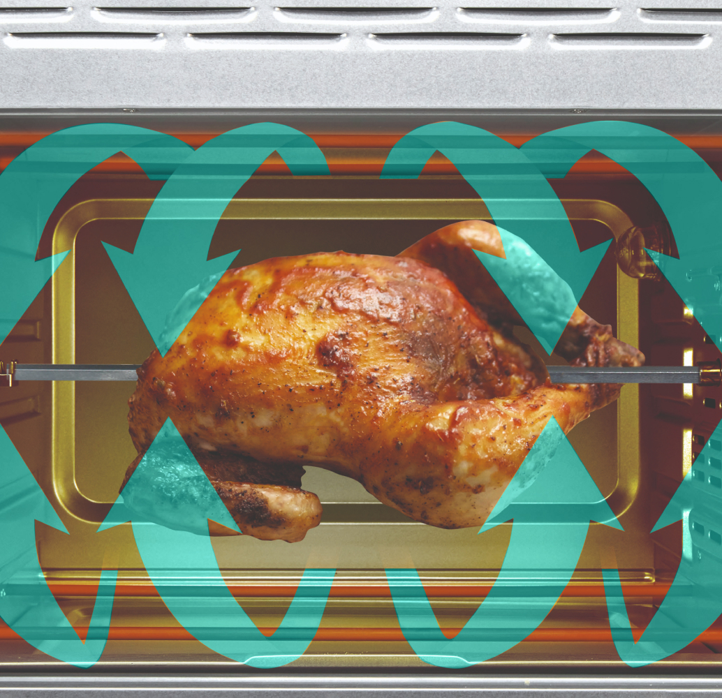 Горячий воздух циркулирует сверху вниз и обратно, тем самым равномерно распределяя тепло. Это позволяет готовить на нескольких уровнях одновременно без смешивания запахов и вкусов. Два нагревателя сверху и два снизу обеспечивают более равномерное пропекание пищи.
