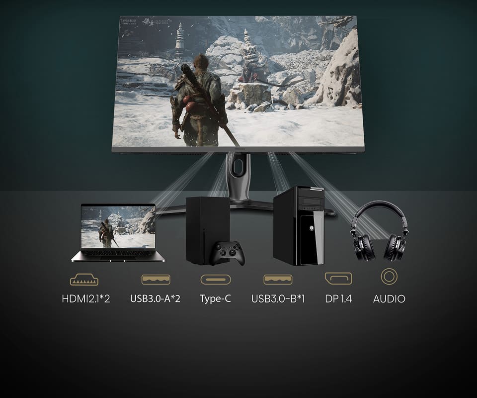 Богатый выбор интерфейсов, включая HDMI, Type-C, USB и DP, и возможность соединения с приставками, ПК, устройствами VR и другой периферией без использования переходников.