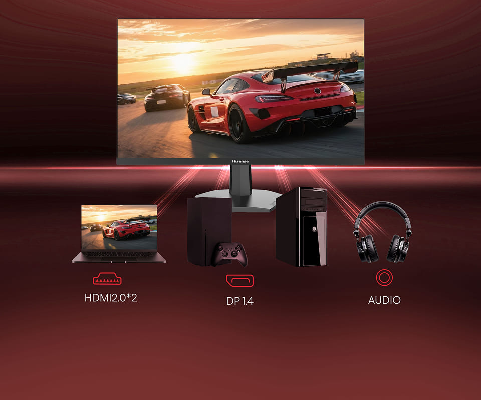 Монитор Hisense G3Q оснащен портами HDMI 2.0, DisplayPort и аудиовыходом для удобного подключения к консолям и аудиооборудованию. За счет поддержки полной пропускной способности каждый сигнал передается без потери качества, что особенно важно для конфигураций из нескольких устройств или потоковой передачи видео высокого разрешения.
