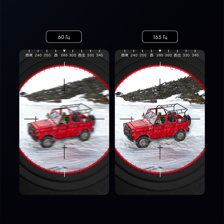 При значении 165 скорость обновления экрана увеличивается на 175% по сравнению с 60 Гц. Отсутствие размытости и подтормаживания изображения на экране делают игровой процесс более плавным и зрелищным.