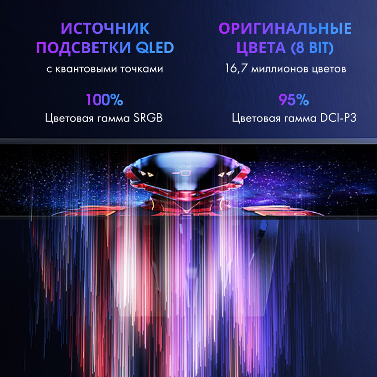 Технология квантовых точек обеспечивает отображение большего количества цветов, чем у стандартных мониторов, что позволяет добиться более насыщенного и реалистичного изображения с охватом DCI-P3 95% и 100% sRGB, что значительно улучшает возможности пользователей в видеоразвлечениях и профессиональном дизайне.