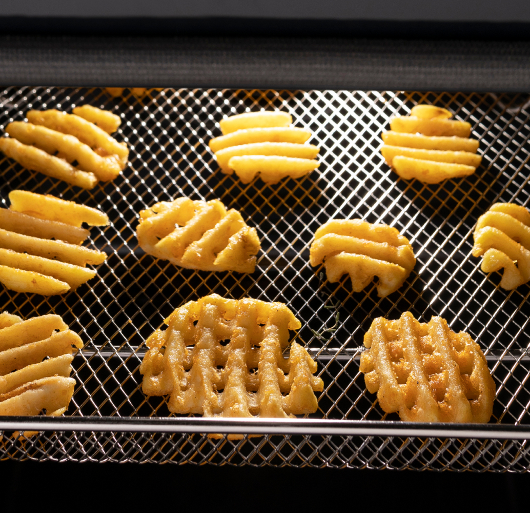 Наслаждайтесь жареной едой без чувства вины! Забудьте о калорийных куриных крылышках и картофеле фри из фритюра и попробуйте их полезную версию с минимальным количеством масла или даже без него. Теперь можно готовить здоровые низкокалорийные блюда с помощью режима интенсивного запекания Air Fry в духовке Hisense без необходимости покупать дополнительный кухонный прибор.