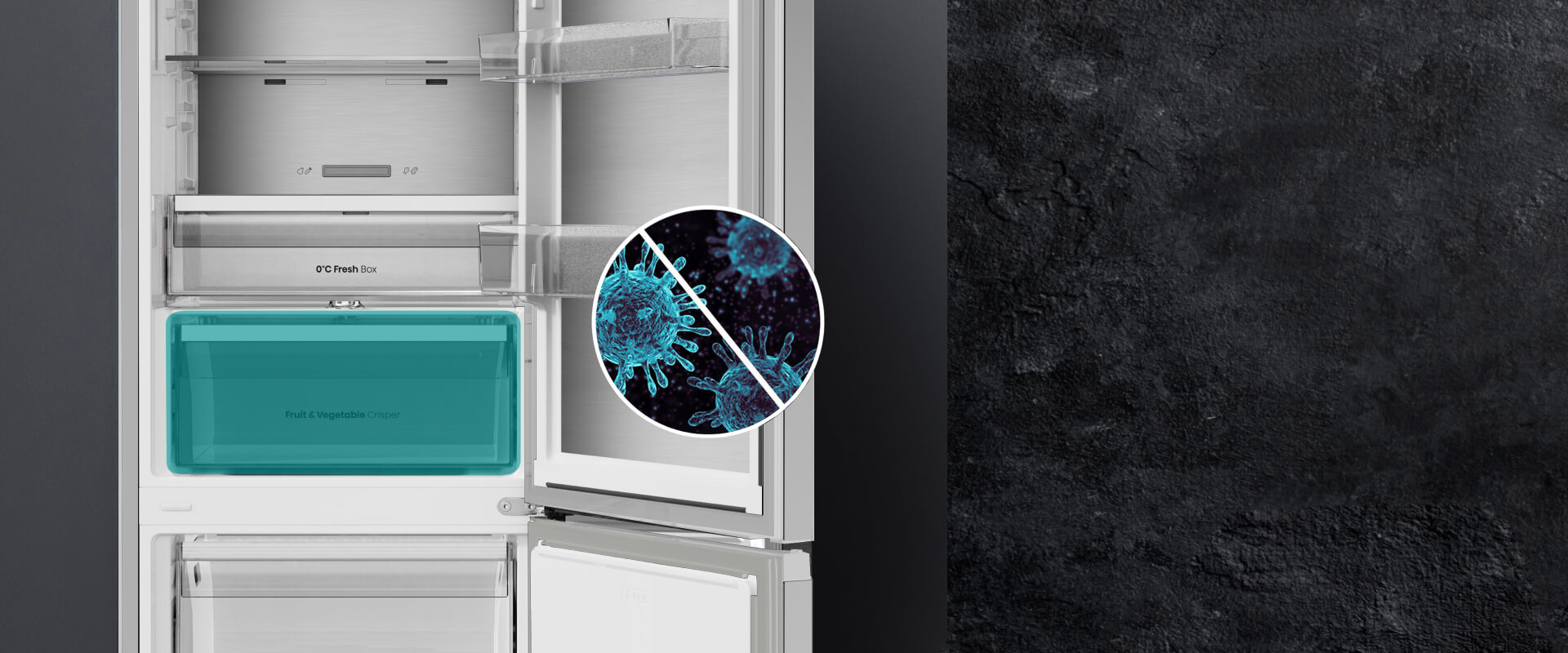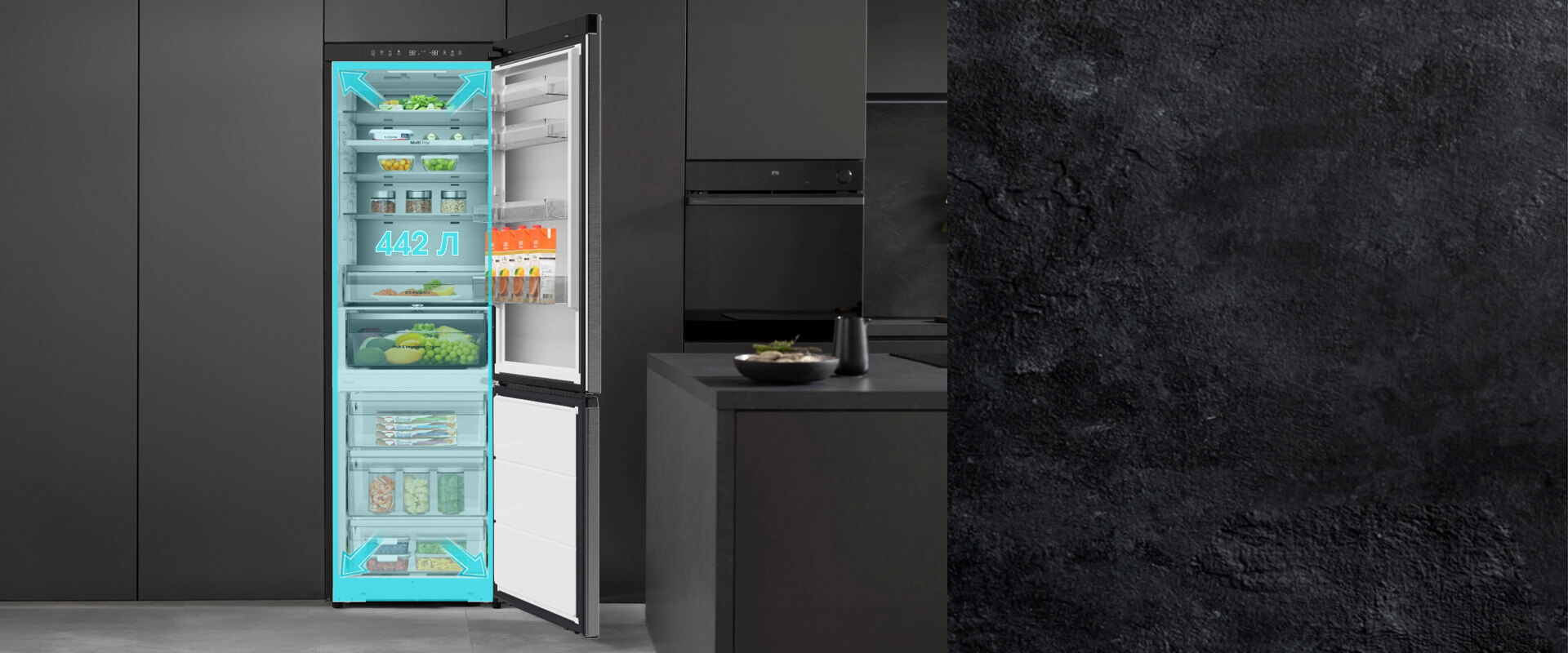 В нижней части холодильной камеры расположена зона свежести с оптимальным микроклиматом — теперь продукты остаются сочными и полезными дольше.