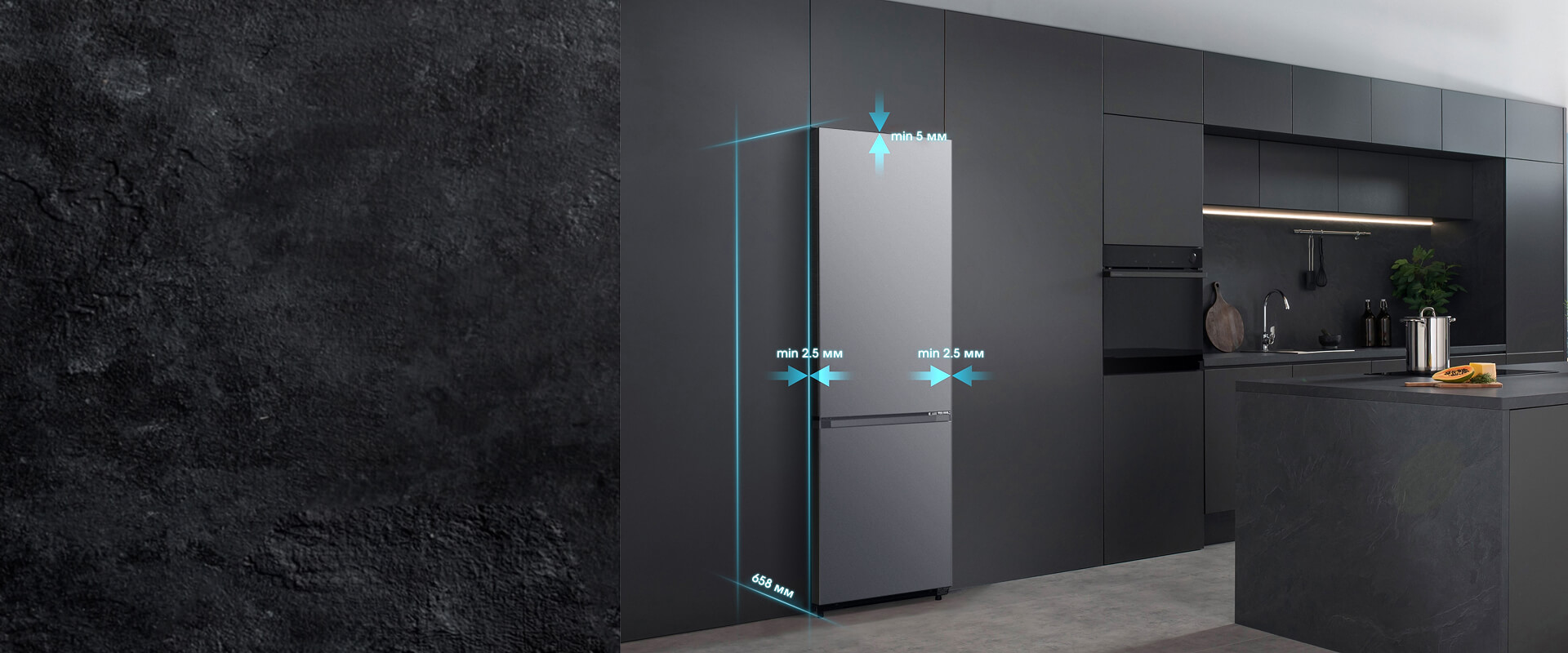 При глубине всего около 65,8 см (без учета дверцы) холодильник разработан таким образом, чтобы вписаться практически в любое кухонное пространство без потери пространства. Благодаря улучшенной конструкции петель обеспечивается открытие дверей на 105°. Зазор до стены ниши не превышает 2,5 мм с обеих сторон и 5 мм сверху.