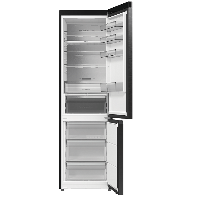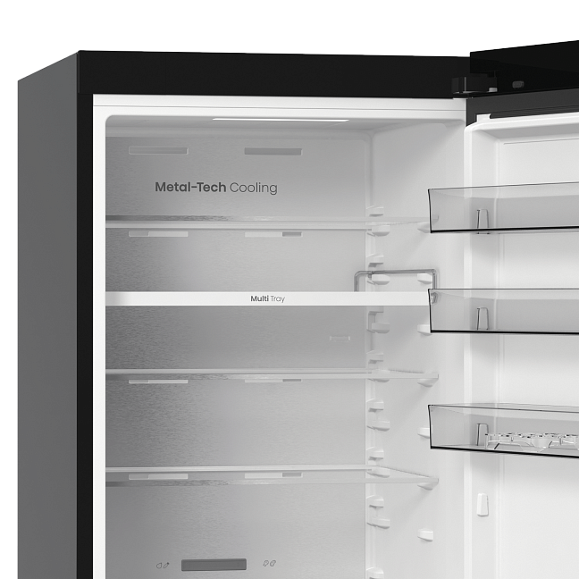 Задняя стенка холодильника выполнена из металла, который равномерно передает холод всей поверхностью. Сочетание передовых технологий обеспечивает идеальную температуру и уровень влажности во всем холодильнике.