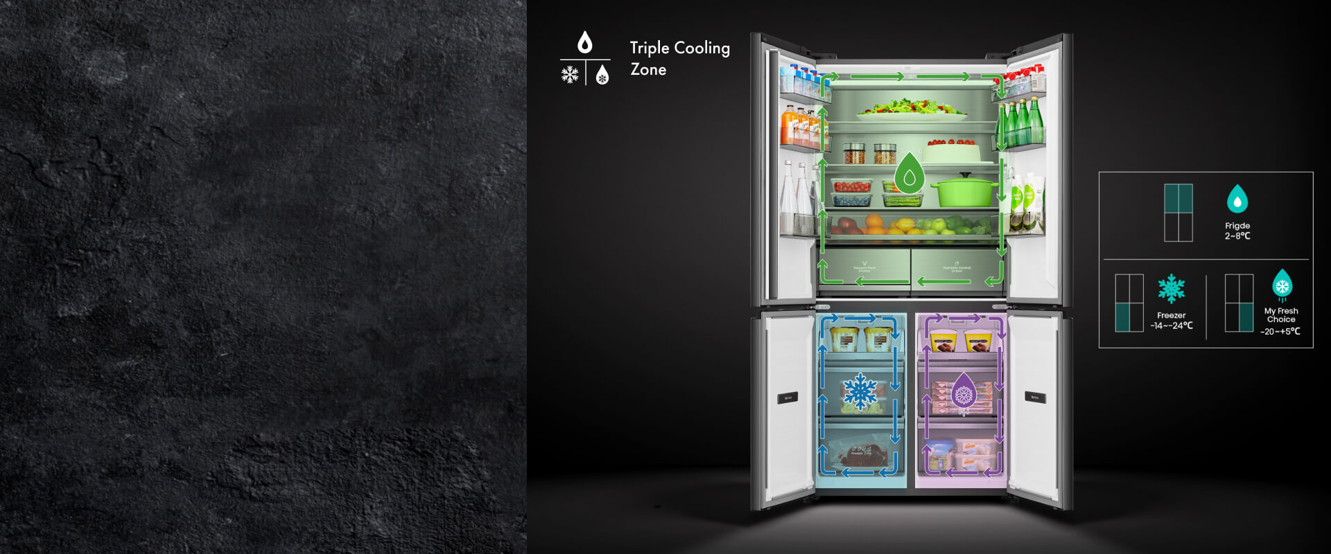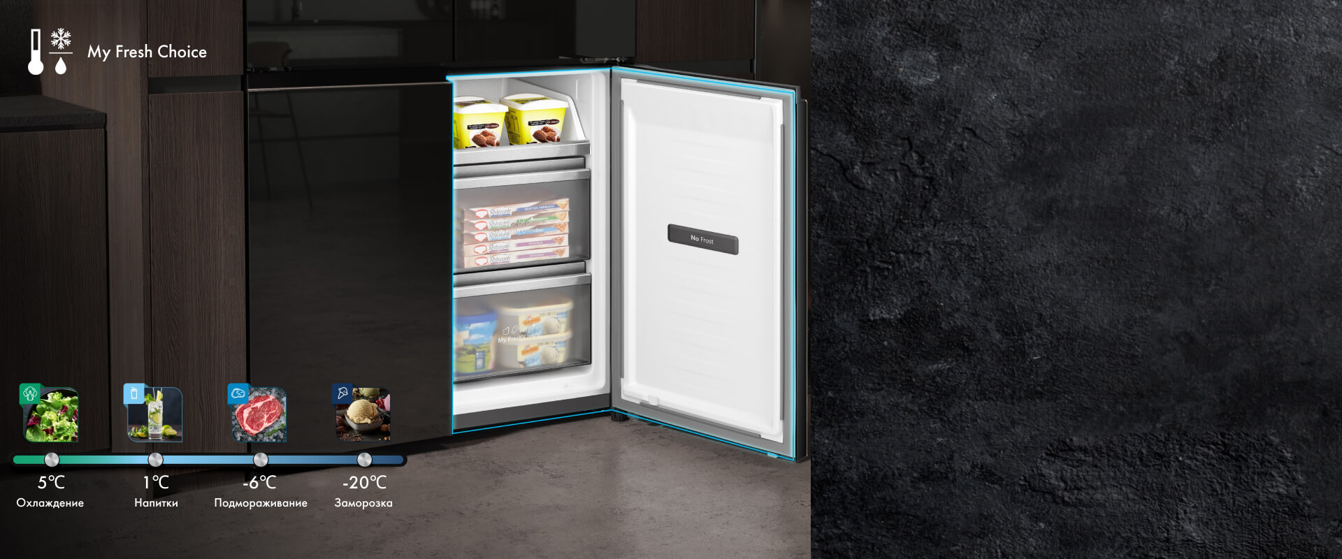 С помощью кнопки «Zone» правое нижнее отделение «My Fresh Choice» легко трансформируется из холодильника в морозильную камеру с температурой от -20°C до +5°C. Создание идеальной температурной среды позволит эффективно продлить свежесть продуктов.