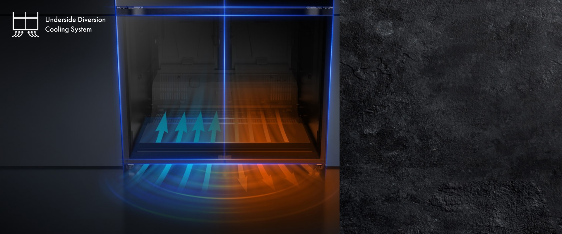 Воздух для охлаждения конденсатора забирается слева и выходит справа. Воздушные потоки разделены и циркулируют между полом и дном холодильника. При использовании этой системы энергоэффективность повышается.