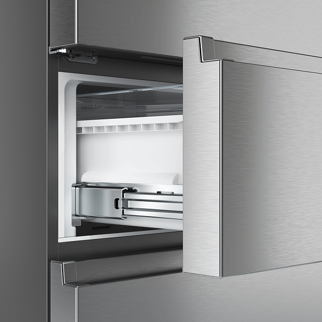 Вынимать или класть продукты из морозильника еще никогда не было так просто. Благодаря плавному скольжению телескопические направляющие обеспечивают легкое выдвижение контейнеров. Металлические направляющие даже в выдвинутом состоянии обеспечивают полную устойчивость и безопасность.
