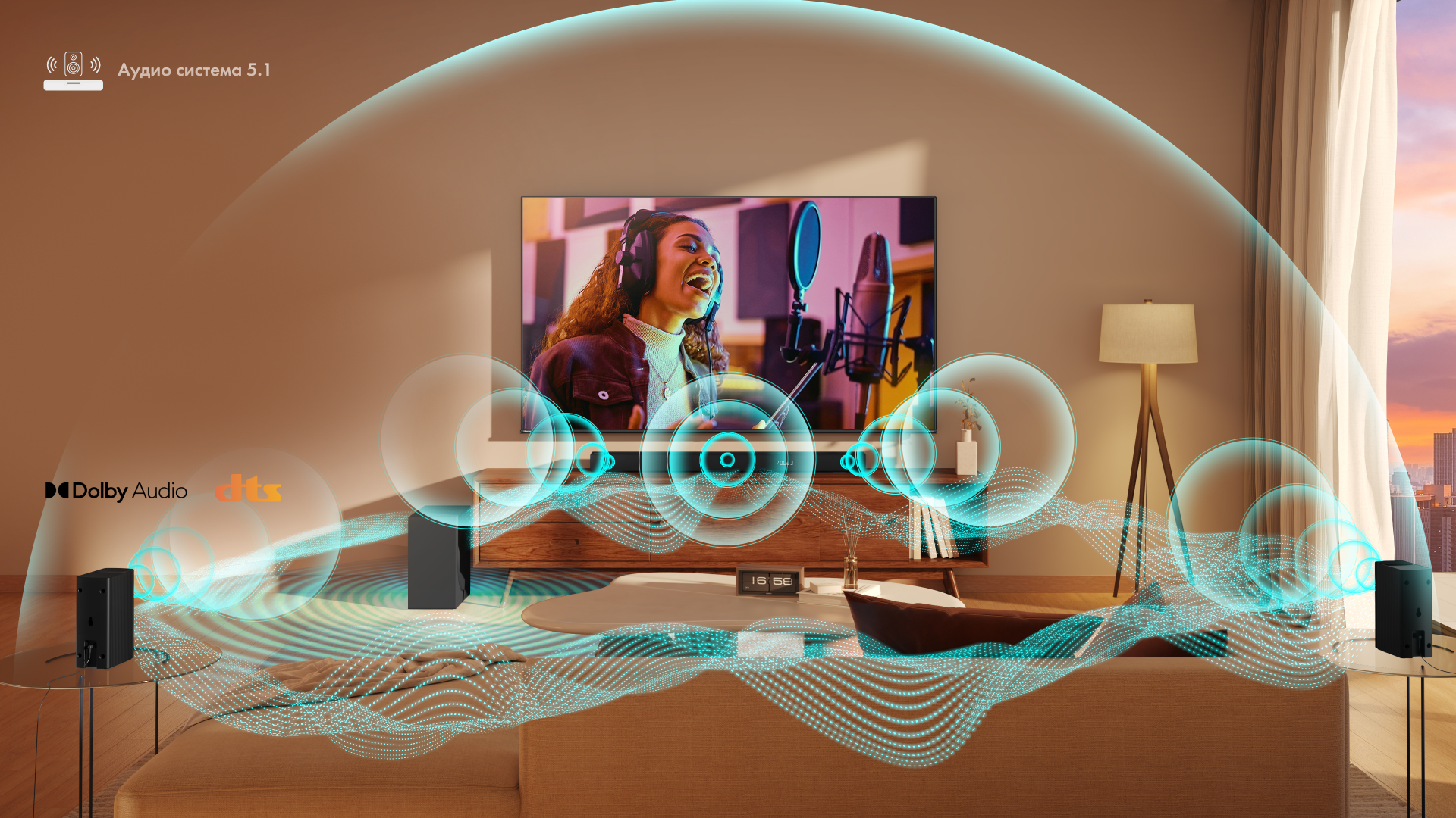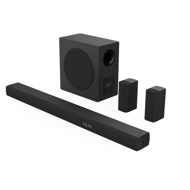 Построенная с использованием технологий Dolby Digital Plus и DTS Surround система окружающего звучания 5.1 (в состав входит фронтальный саундбар, беспроводной сабвуфер и тыловые колонки) вдыхает новую жизнь в звучание фильмов, музыки и игровых треков. Помимо этого, благодаря кодеку DTS Virtual:X, звук HS5100 в любом помещении обретает полноту и дарит эффект погружения.