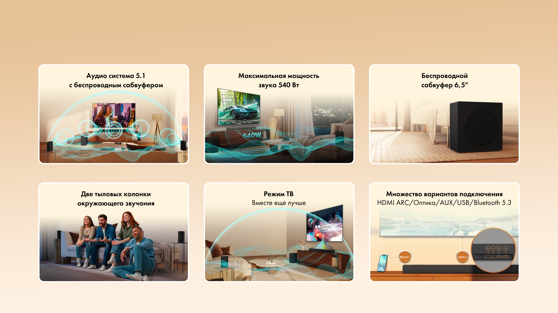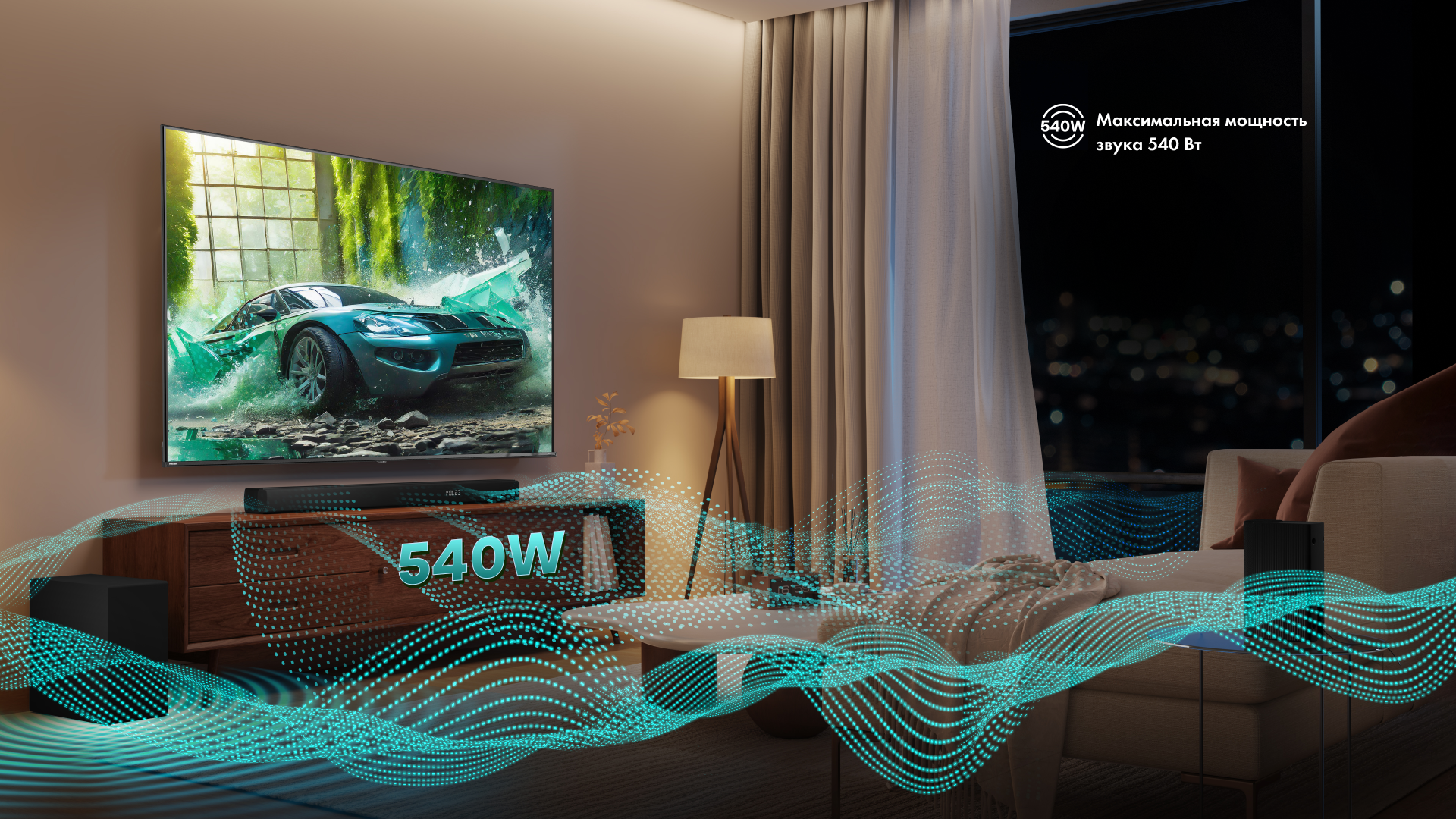 Держитесь крепче. 8 динамиков выдают суммарно 540 Вт максимальной мощности. Наполняйте комнату звучанием и еще полнее раскрывайте глубину своих аудиальных впечатлений. Пора добавить звука!