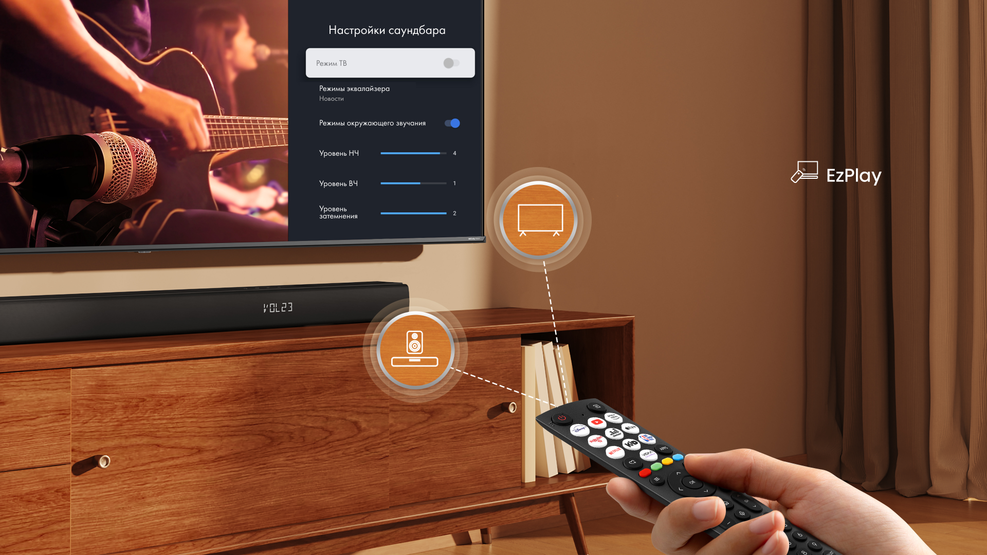 Меню настроек саундбара отображается на экране ТВ, поэтому управлять звучанием саундбара Hisense можно также легко при помощи пульта от телевизора Hisense.