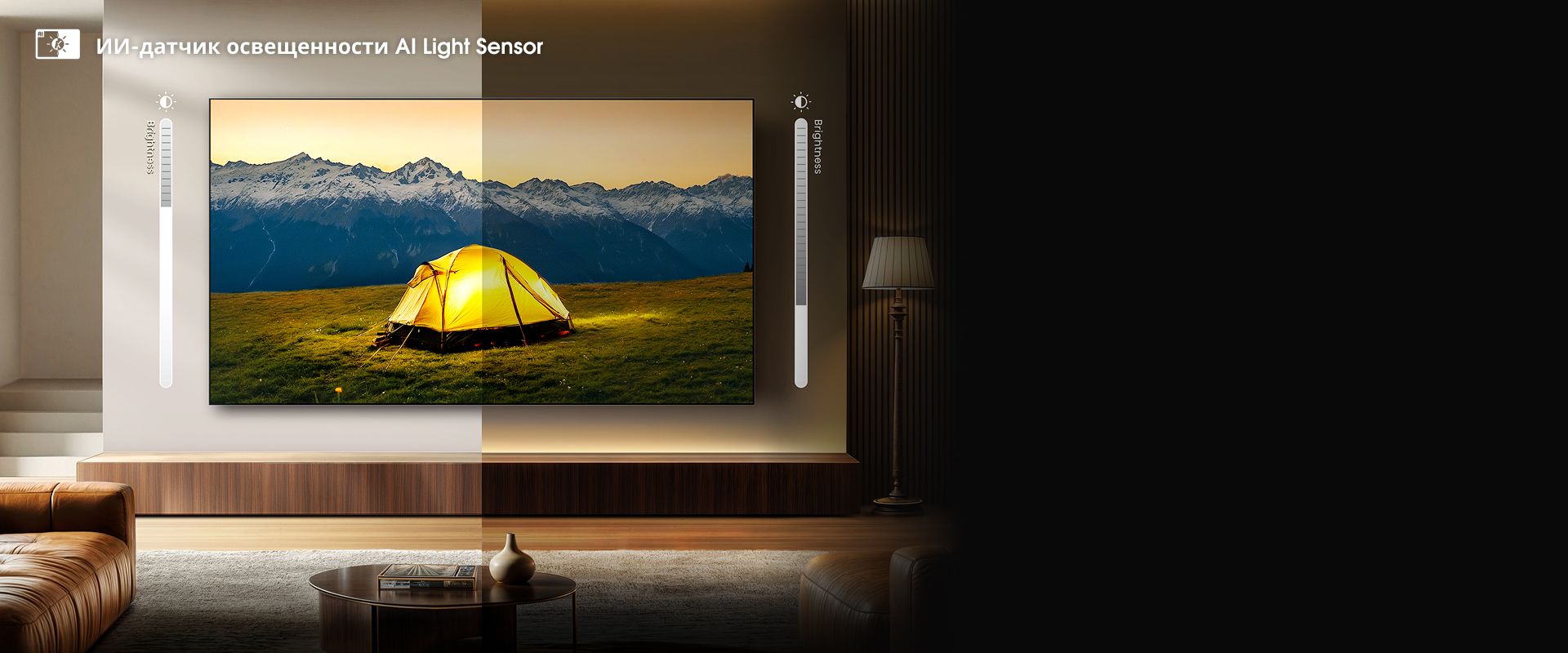 Автоматическая регулировка яркости для любой комнаты и любого времени суток. Датчик освещенности с ИИ регулирует подсветку в режиме реального времени в зависимости от окружающего освещения, поддерживая оптимальное качество изображения независимо от времени суток. Наслаждайтесь максимальной яркостью днем и комфортным просмотром ночью без необходимости ручной регулировки.