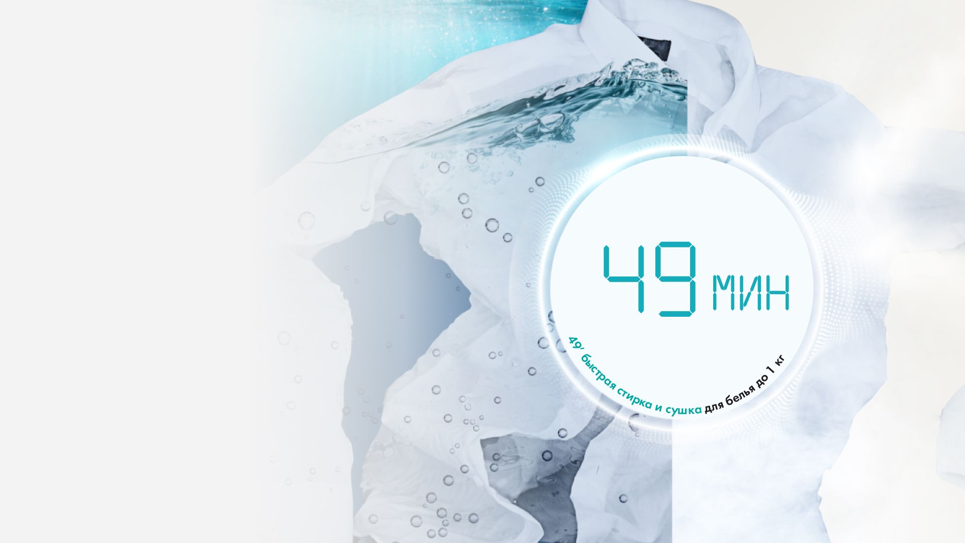 Идеальное решение для повседневной стирки! Не нужно тратить время на выбор программы для небольших партий белья. Удобная программа «Стирка и сушка 49’» постирает и полностью высушит до 1 килограмма белья всего за 49 минут.