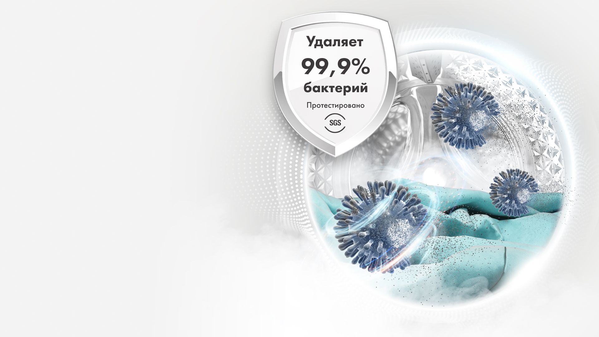 Включите машину, и горячий пар начнет поступать снизу барабана. Он глубоко проникает в ткань, удаляя 99,99%* бактерий для по-настоящему гигиеничной обработки белья. Специальная программа «Детские вещи» и антибактериальная манжета люка обеспечивают дополнительный уровень защиты и дарят вам полное спокойствие.