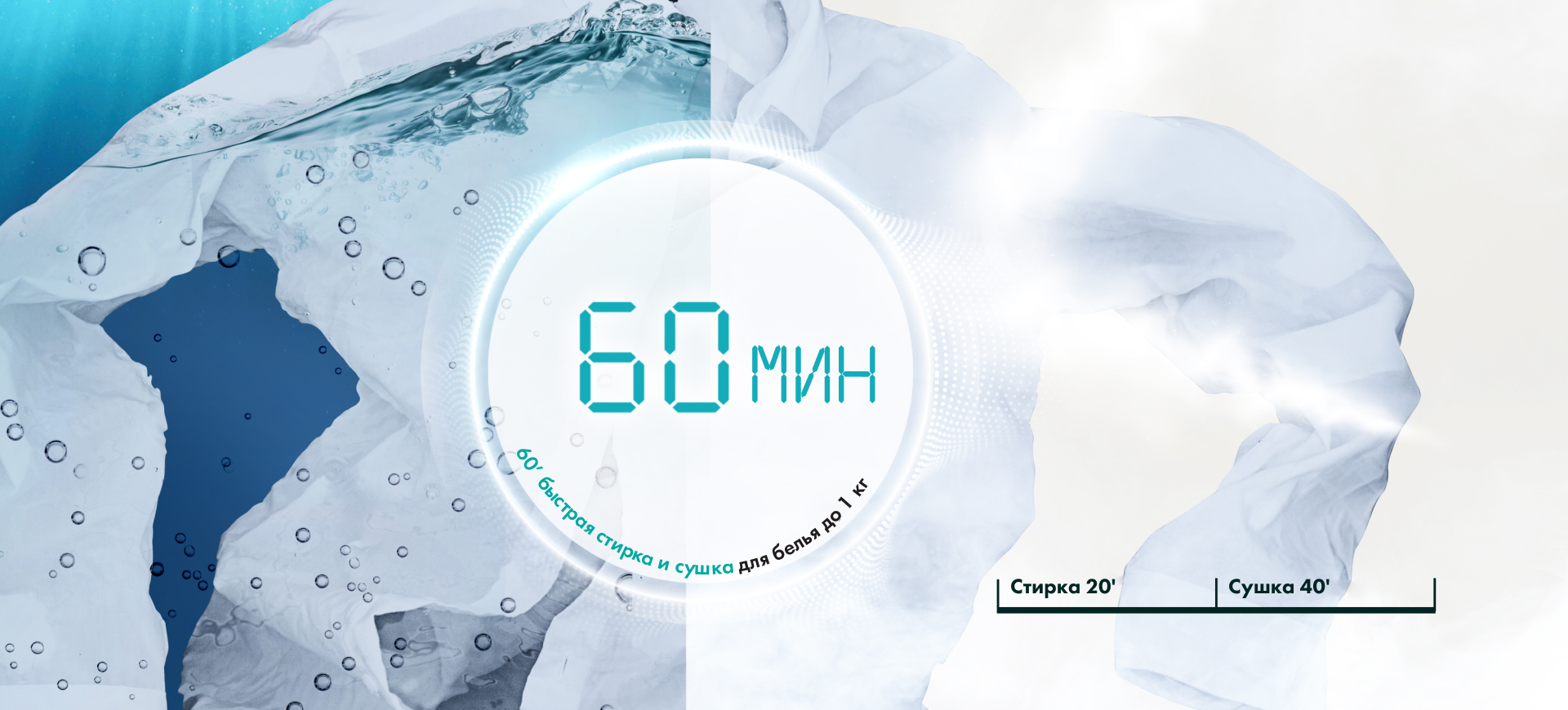 Нужно быстро постирать и высушить любимую футболку? Специально для таких случаев предусмотрели программу Wash&Dry 60', которая идеально подойдет для вещей весом не более 1 кг.
