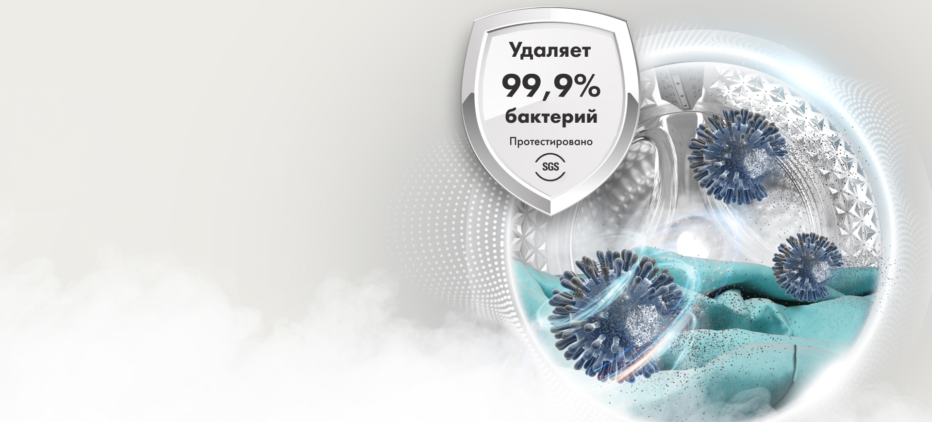 Дополнительная обработка паром, в качестве предварительной программы стирки, удаляет с одежды подавляющее большинство микробов и бактерий.