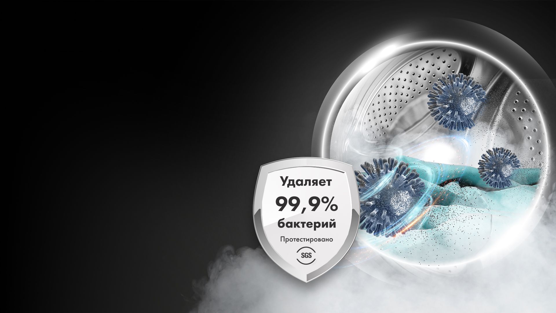 Горячий пар глубоко проникает в ткань, удаляя 99,99%* бактерий для по-настоящему тщательной обработки белья. Горячий пар в сочетании с антибактериальной резиновой манжетой дверцы гарантируют безупречную чистоту и защиту здоровья ваших близких.