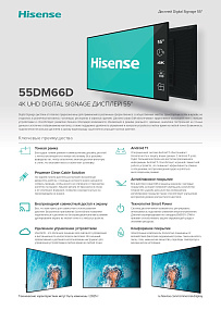 Digital Signage дисплеи от Hisense предназначены для применения в различных сферах бизнеса: в общественных местах, транспортных сетях и музеях, на стадионах, в розничных магазинах, гостиницах, ресторанах и офисных зданиях. Дисплеи серии DM обеспечивают эффективное взаимодействие с любыми устройствами и способствуют развитию бизнеса благодаря возможности обновления в режиме реального времени, аналитике построенной на точных данных и эстетично отображаемому контенту, а также поддержке удалённого управления и контроля устройств в любое время из любой точки. Возможность подключения нескольких дисплеев к одному видеовыходу существенно упрощает монтаж кабелей.