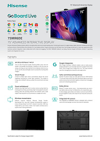 Интерактивные панели Hisense предлагают непревзойденную производительность и лучшее соотношение цены и качества на рынке. Сочетая возможности цифрового дисплея, планшета, электронной доски и устройства для видеоконференций, они представляют собой идеальное решение «все в одном». Мощные процессоры и передовые сенсорные технологии обеспечивают невероятное удобство использования, а беспроводная интеграция делает совместную работу простой и увлекательной. Новая интерактивная панель 75MR6DE GoBoard Live сертифицирована Google, работает на операционной системе Android 13 и оснащена встроенной камерой 4K.