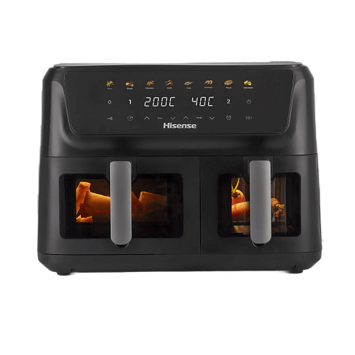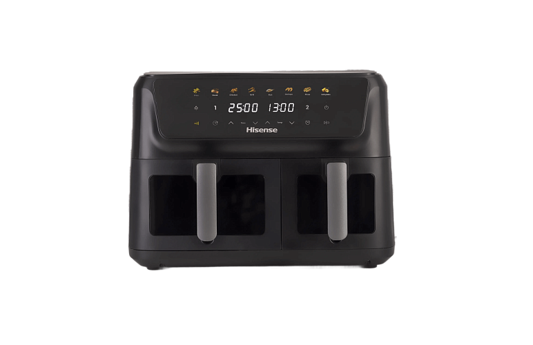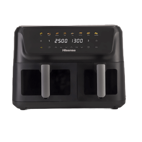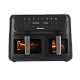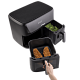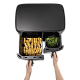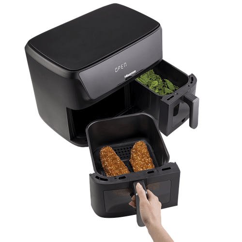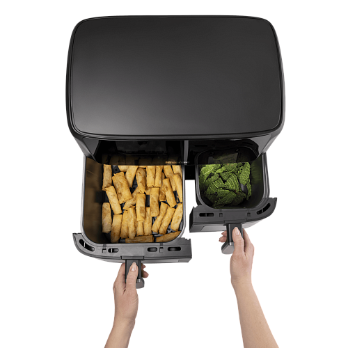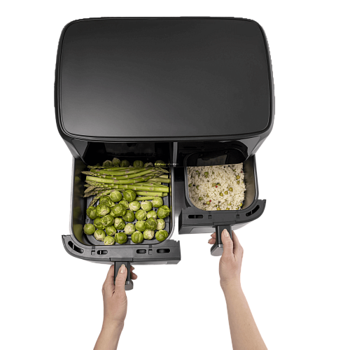 Две отдельные корзины, каждая из которых оснащена собственным нагревательным элементом и циклонным вентилятором, позволяют готовить разные продукты одновременно без смешивания запахов.