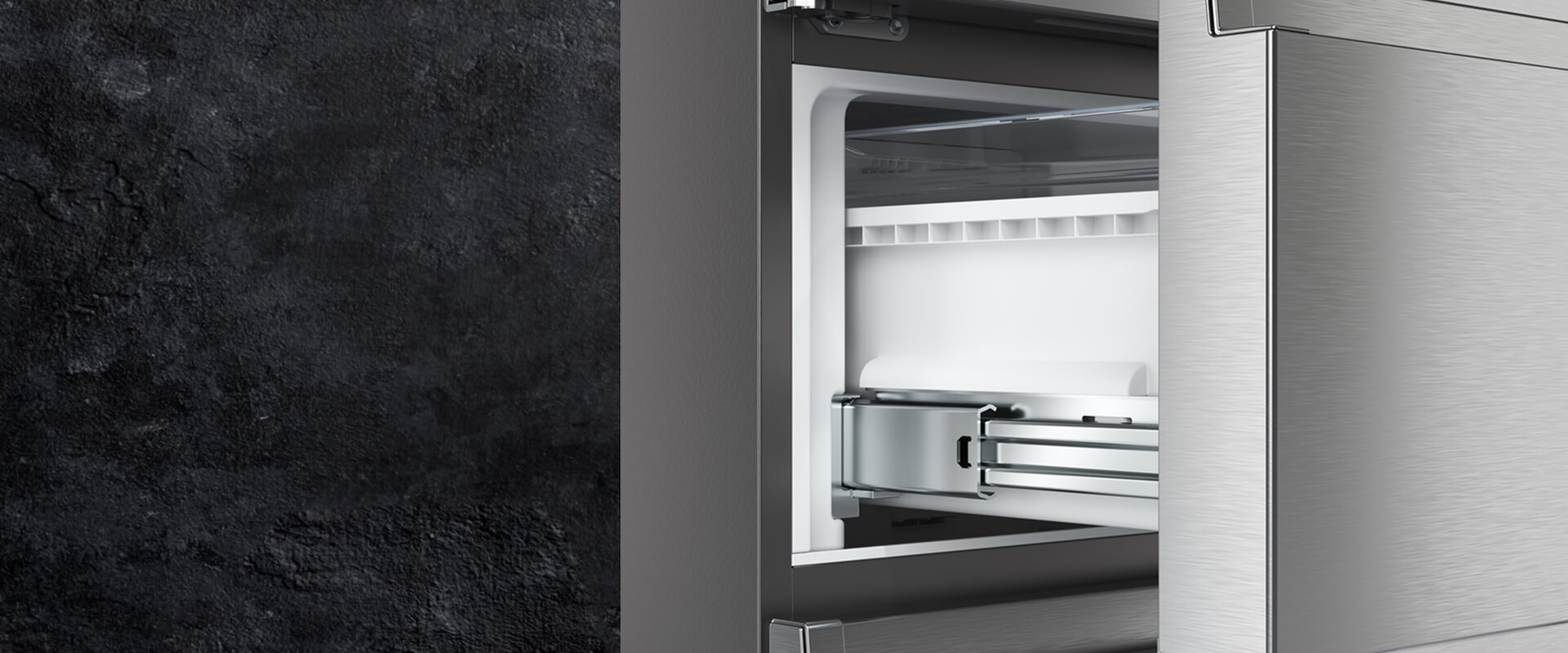 Вынимать или класть продукты из морозильника еще никогда не было так просто. Благодаря плавному скольжению телескопические направляющие обеспечивают легкое выдвижение контейнеров. Металлические направляющие даже в выдвинутом состоянии обеспечивают полную устойчивость и безопасность .