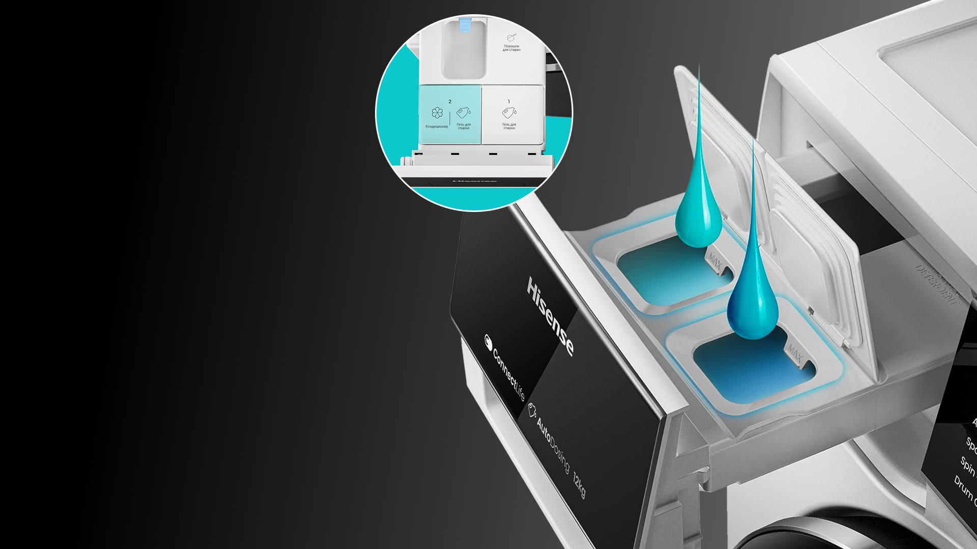 Просто загрузите бельё — машина серии 5i сама добавит нужное количество моющего средства, исходя из веса белья. Контейнер рассчитан на 27 стирок, так что не нужно доливать средство каждый раз. А в левый отсек дозатора можно залить как кондиционер, так и дополнительное моющее средство — это удобно и экономит время.