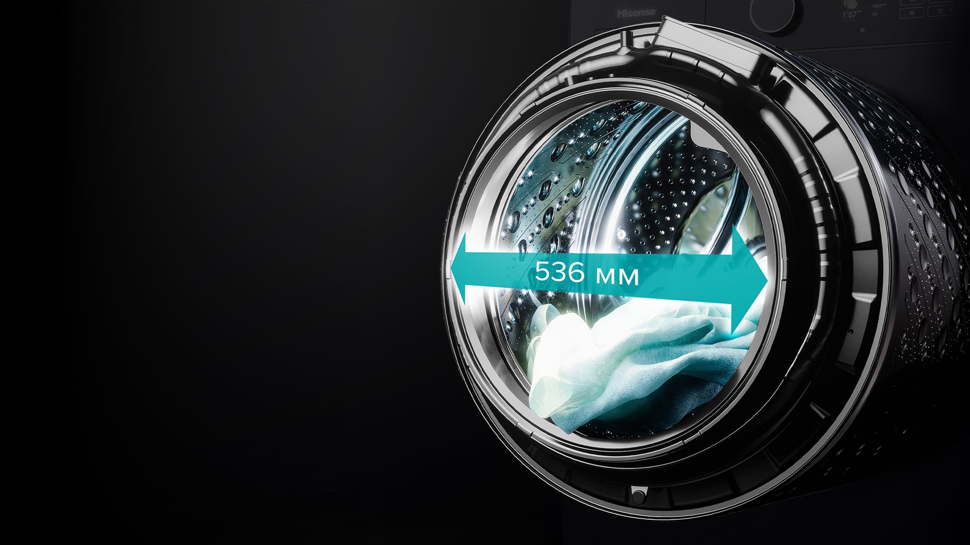 Диаметр 536 мм позволяет стирать больше белья за раз. Вещи свободно двигаются внутри — стирка получается эффективной. Широкий люк упрощает загрузку и выгрузку, а также помогает легко находить мелкие вещи.